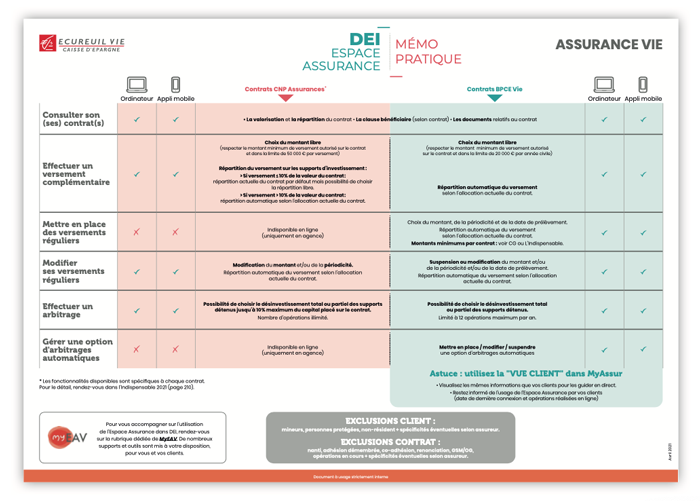 Nos clients détenteurs de contrats CNP Assurances peuvent désormais consulter leur contrat et effectuer des opérations sur leur appli Caisse d’Epargne ou Banxo. Pour aider votre client à activer son accès, vous pouvez lui remettre la fiche « CNP – fiche client mode opératoire activation contrats dans appli mobile » à télécharger depuis MyEAV Produits et ventes > VAD/DEI > DEI.