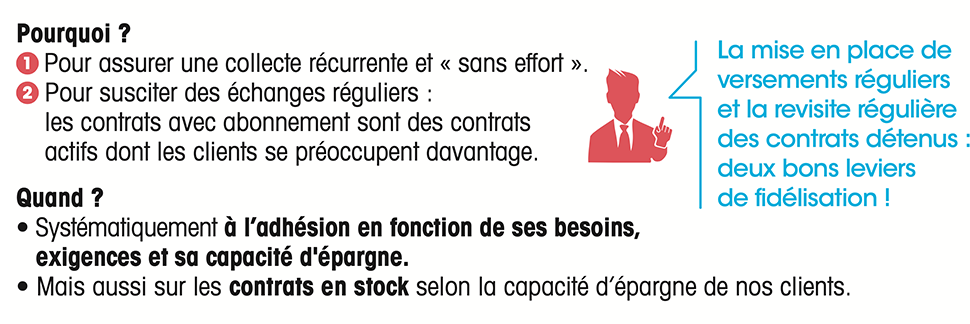 Ensuite, pour poursuivre la progression de la collecte, continuons à équiper de nouveaux clients. Et proposons-leur systématiquement l’abonnement, qui assure une collecte récurrente et permet à nos clients de lisser leurs investissements sur les marchés financiers.