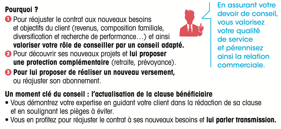 Nous avons par ailleurs de nombreuses opportunités pour recontacter nos clients détenteurs. Par l’approche retraite, la diversification de leur épargne ou bien l’actualisation de la clause bénéficiaire, c’est souvent l’occasion de proposer un versement libre, la mise en place de versements réguliers, le transfert du contrat ou la révision des supports d’investissements.