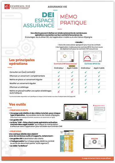 Nos clients détenteurs de contrats CNP Assurances peuvent désormais consulter leur contrat et effectuer des opérations sur leur appli Caisse d’Epargne ou Banxo. Pour aider votre client à activer son accès, vous pouvez lui remettre la fiche « CNP – fiche client mode opératoire activation contrats dans appli mobile » à télécharger depuis MyEAV Produits et ventes > VAD/DEI > DEI.