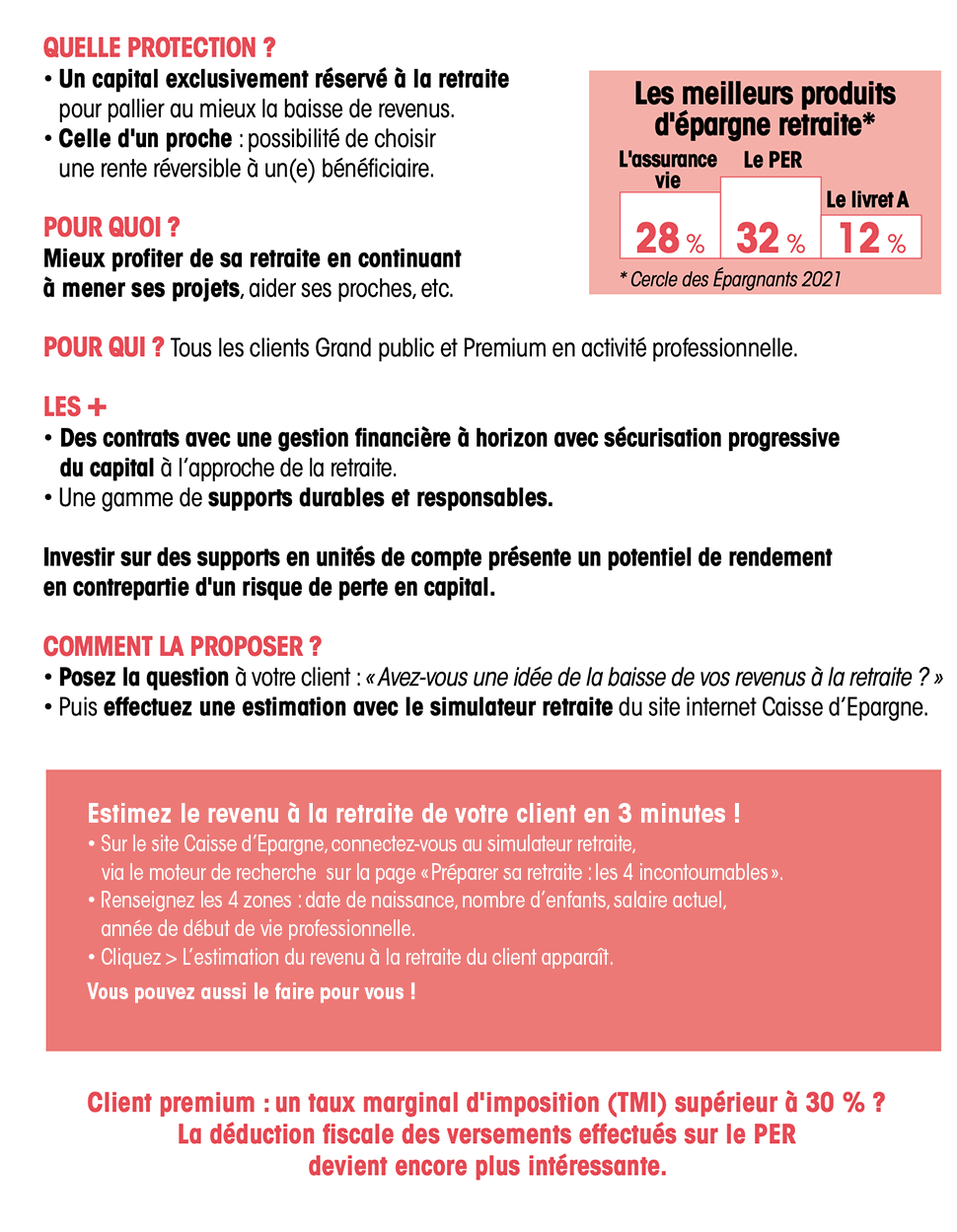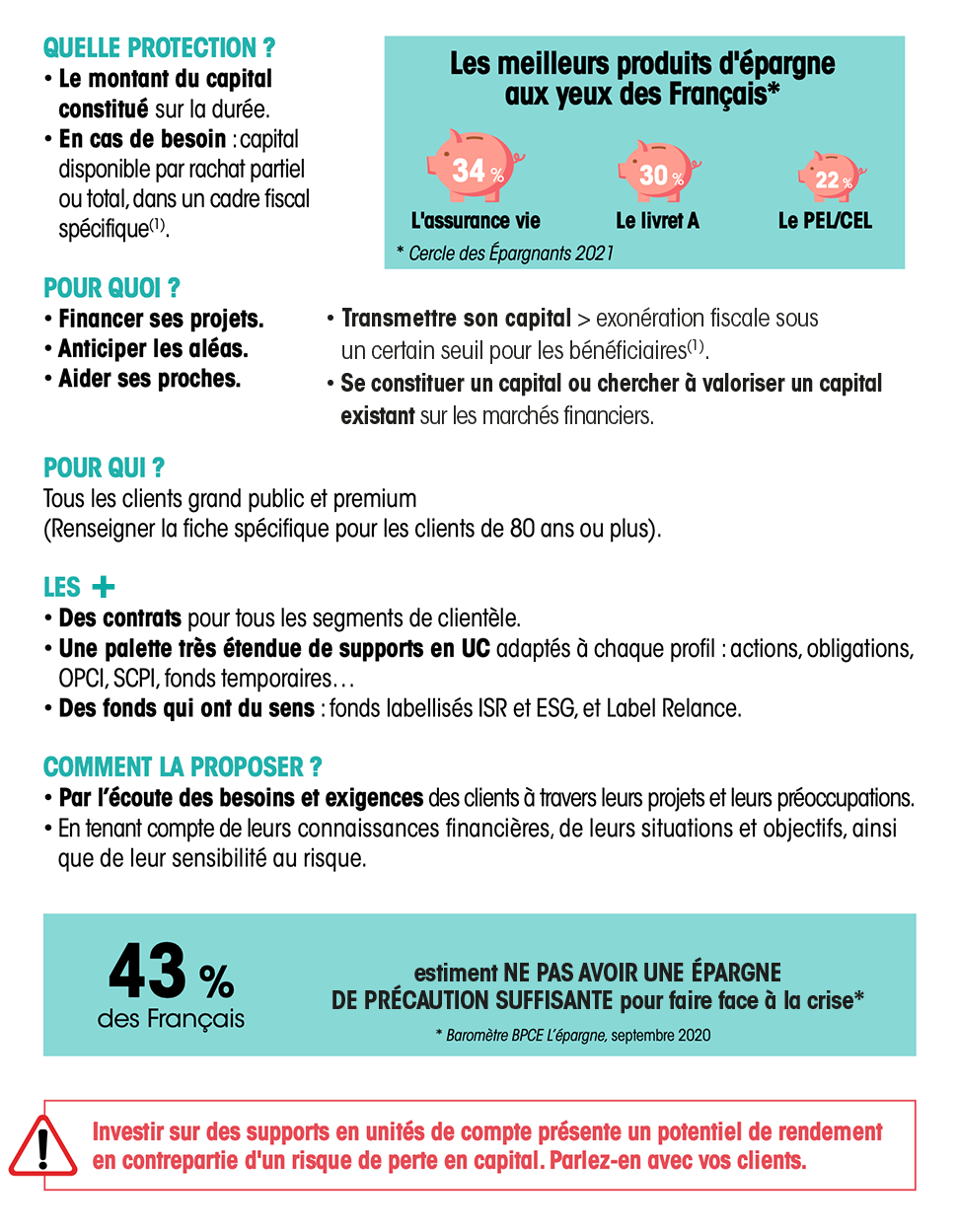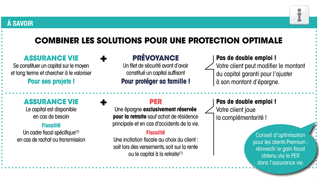 Comment préserver son niveau de vie, sa capacité d’épargne, ses revenus à la retraite, son patrimoine ? Avoir de quoi être financièrement à l'abri, notamment face aux aléas, était une préoccupation déjà bien affirmée chez les épargnants ; le contexte récent l’a renforcée, générant un besoin accru. Vous avez tout entre les mains pour accompagner et rassurer vos clients : car, qu’il s’agisse d’épargne de précaution, de prévoyance ou de retraite, pour chacun la solution existe... et même plusieurs !