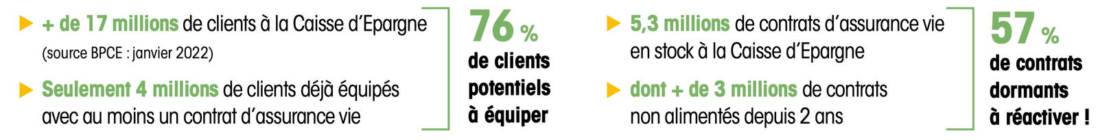 Un contrat ouvert, mais qui dort, a peu de chances de répondre encore aux besoins et exigences du client et ne produit plus aucun effet sur la collecte. Pourtant, à la Caisse d’Epargne, sur plus de 5 millions de contrats d’assurance vie en stock, près de la moitié est inactive depuis plus de 4 ans ! C'est un vivier extraordinaire de clients à recontacter et à qui proposer une « révision technique » de leur contrat afin de l’adapter à leurs besoins actuels et leur permettre d’en exploiter tout le potentiel.